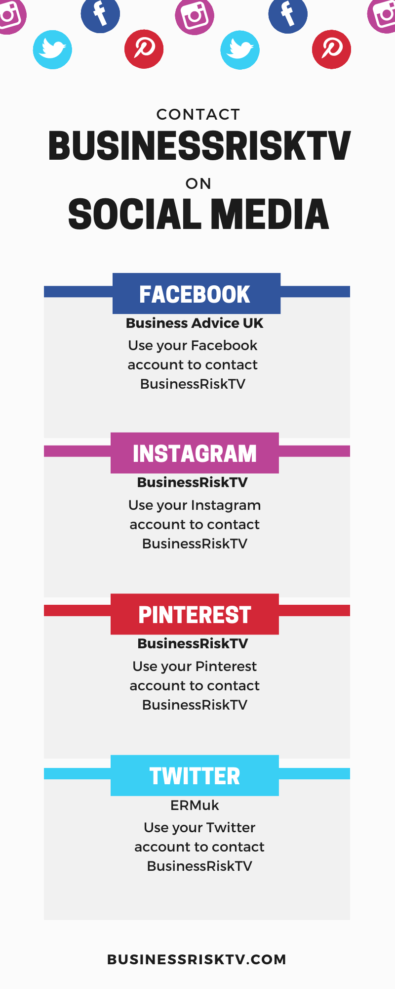 Previous image Next image Contact BusinessRiskTV On Social Media Facebook Instagram Pinterest Twitter Contact BusinessRiskTV On Social Media Facebook Instagram Pinterest Twitter Contact BusinessRiskTV On Social Media Facebook Instagram Pinterest Twitter