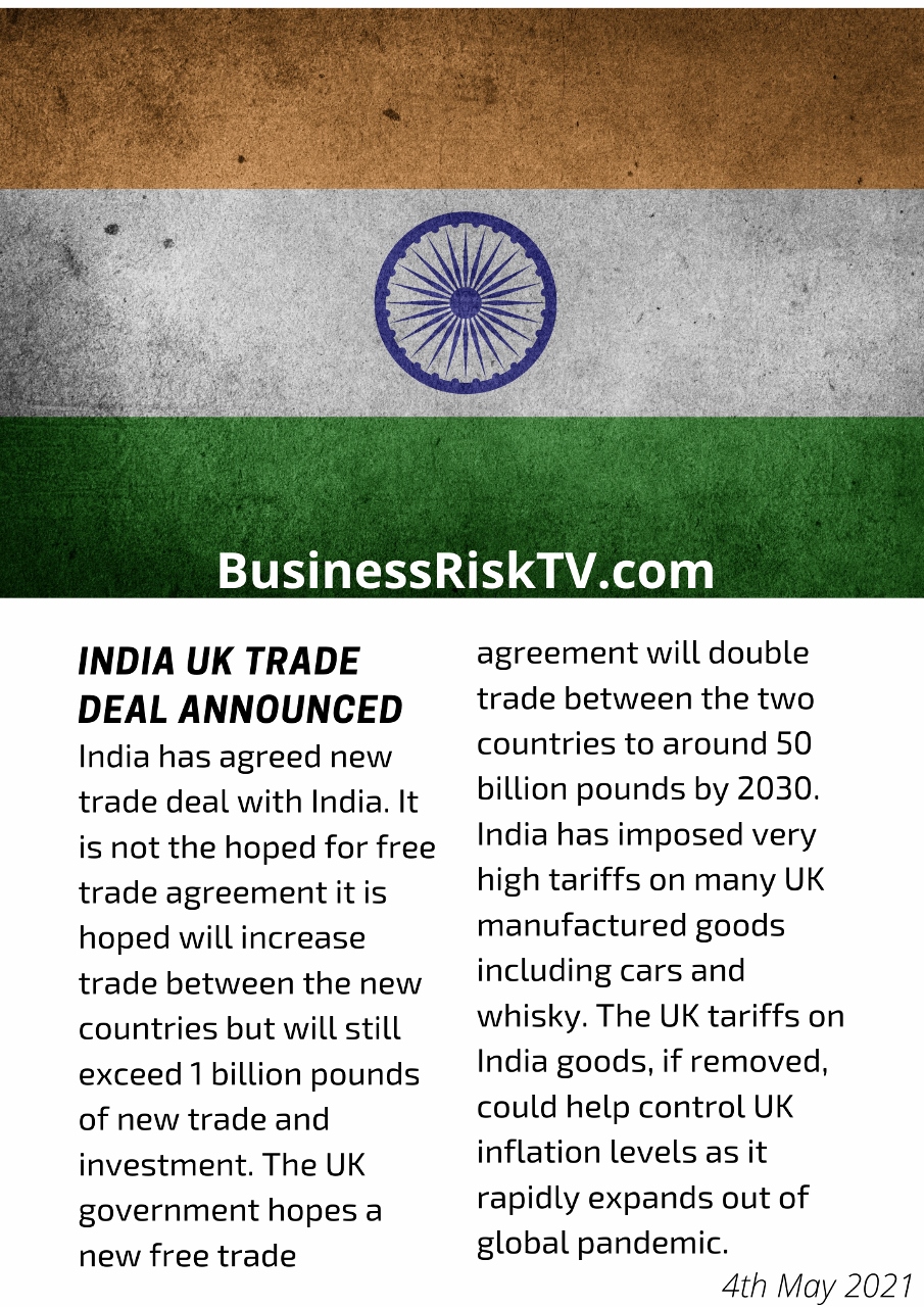 India has agreed new trade deal with India. It is not the hoped for free trade agreement it is hoped will increase trade between the new countries but will still exceed 1 billion pounds of new trade and investment. The UK government hopes a new free trade agreement will double trade between the two countries to around 50 billion pounds by 2030. India has imposed very high tariffs on many UK manufactured goods including cars and whisky. The UK tariffs on India goods, if removed, could help control UK inflation levels as it rapidly expands out of global pandemic.