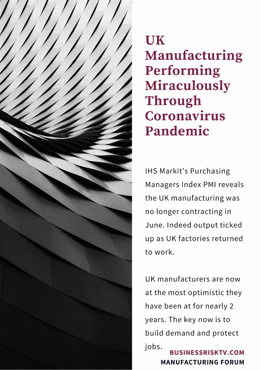 UK Manufacturing Industry Report End June 2020. UK manufacturers return to growth in June and are more confident in their future in longer term. In short term concerns rise for job retention and increasing demand for manufactured goods domestically and internationally.